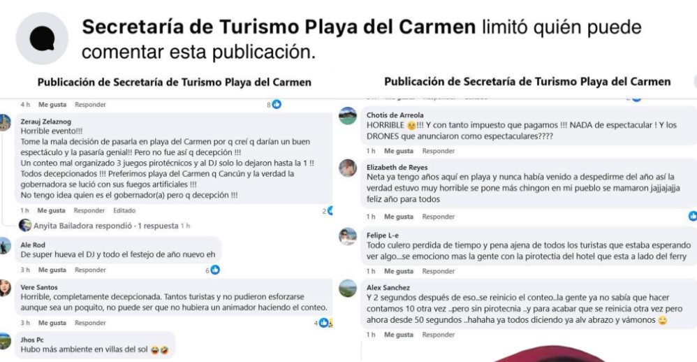 Luego de que su publicación sobre el Playa Fest Año Nuevo 2026 sirviera para la expresión de severas críticas a la organización, la Secretaría de Turismo de Playa del Carmen borró los comentarios y los restringió.
