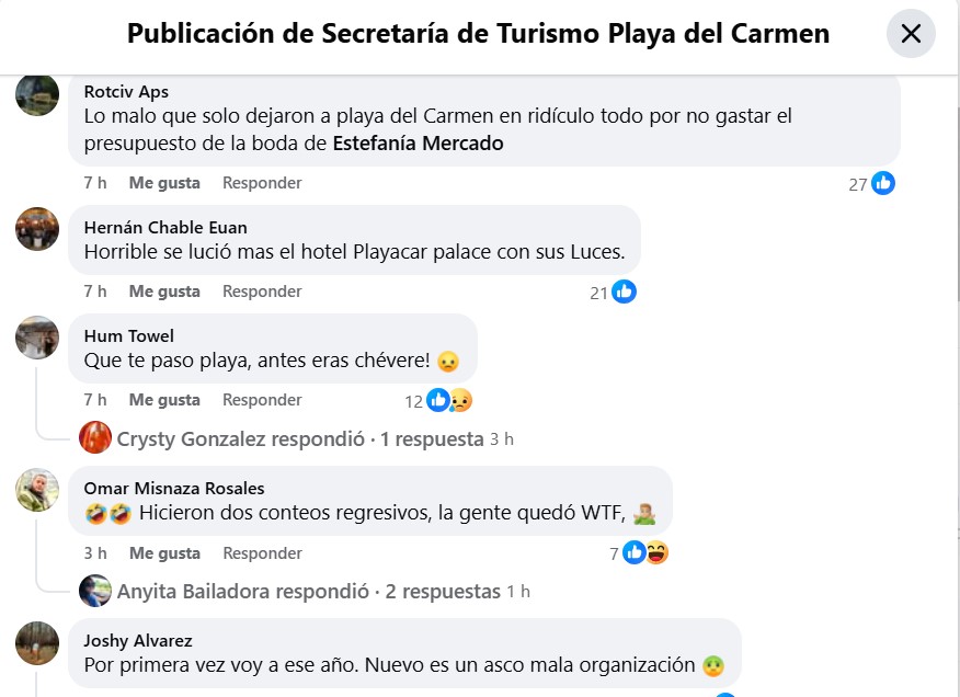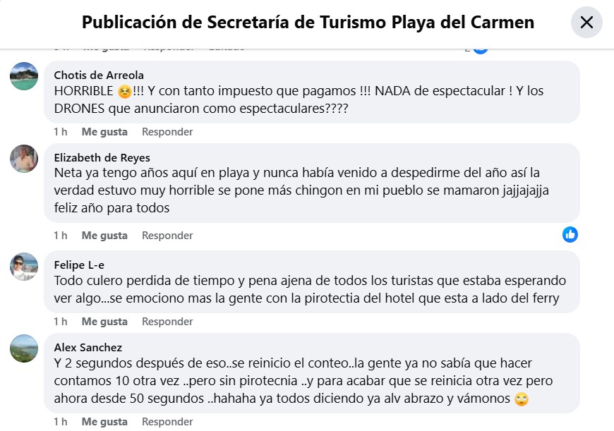 Así amanecieron los cometarios a las publicaciones sobre el festival en la página de la Secretaría de Turismo del ayuntamiento de Playa del Carmen, con duras críticas principalmente contra la pobreza de pirotecnia, un conteo regresivo tan mal organizado que se realizó dos veces y música de DJ que se cortó a la una de la madrugada, cuando la fiesta apenas comenzaba, señalan asistentes arrepentidos de haber cambiado Cancún por este destino para recibir el año.