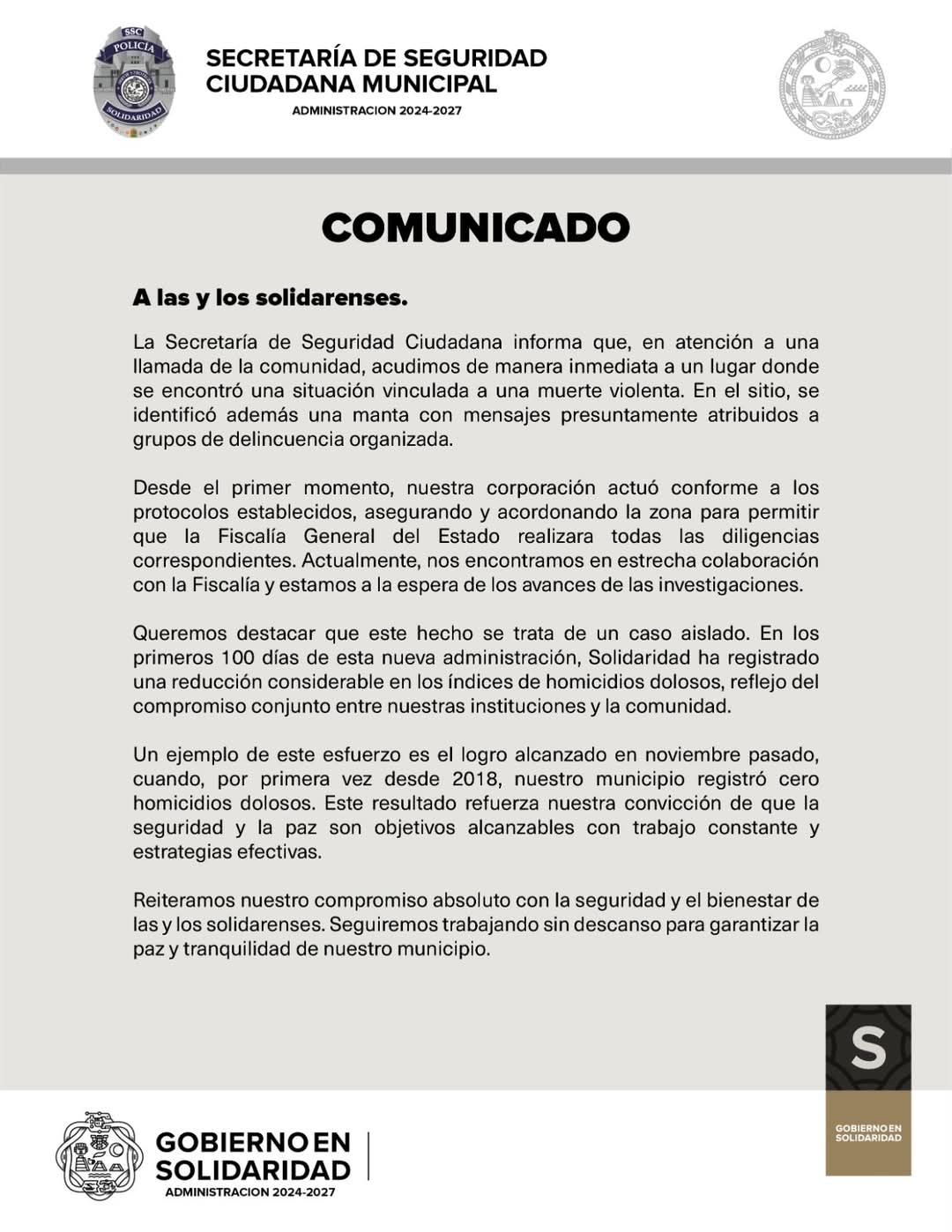 Tras registrarse estos hechos, el gobierno de Solidaridad emitió un comunicado en dónde refieren que este suceso se trata de un caso aislado, “pues en los primeros 100 días de esta nueva administración, Solidaridad ha registrado una reducción considerable en el indice de homicidios dolosos, reflejo del compromiso conjunto entre nuestras instituciones y la comunidad”.