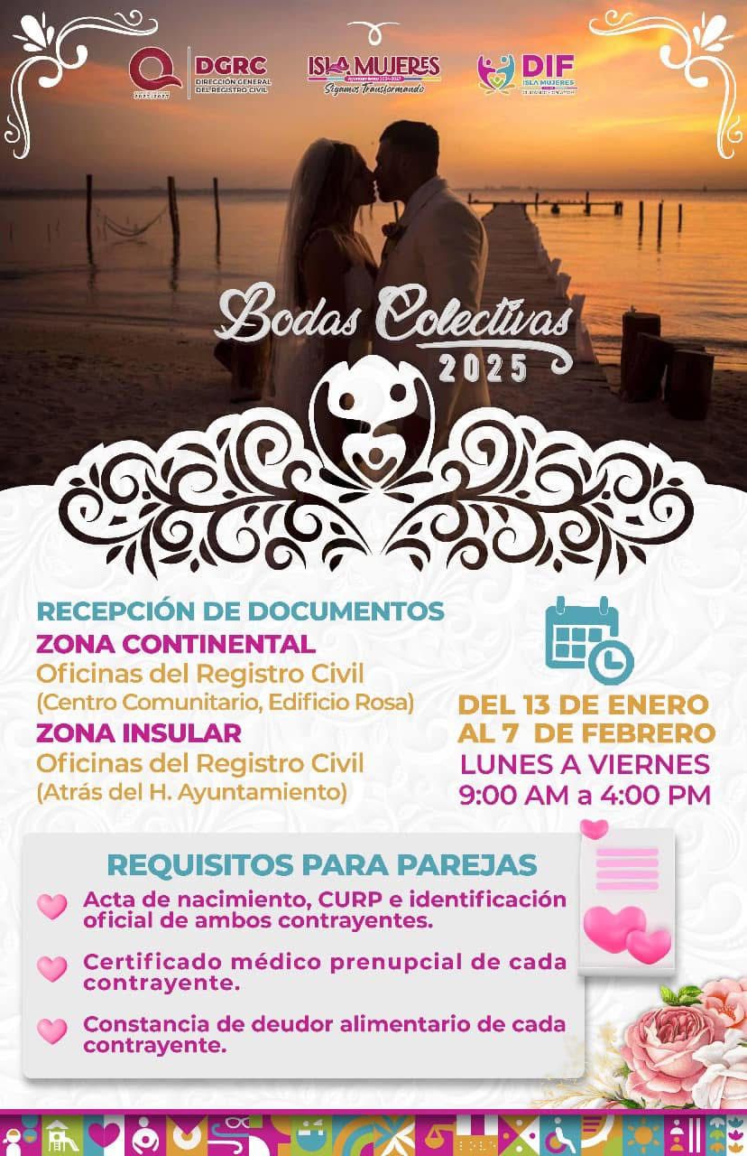 El Ayuntamiento de Isla Mujeres, reafirma su compromiso con el bienestar de las familias isleñas y extiende esta invitación a todas las parejas que deseen dar este importante paso en un evento que simboliza el amor y la unión.
