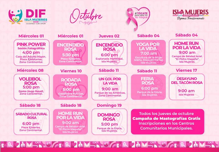 Isla Mujeres, Quintana Roo a 02 de octubre de 2025.- El Gobierno Municipal que encabeza la alcaldesa Atenea Gómez Ricalde, a través del Sistema para el Desarrollo Integral de la Familia (DIF) Isla Mujeres, anunció una nutrida agenda de actividades en el marco del Mes Rosa, como parte de la Campaña “Tócate para que no te toque”, que busca sensibilizar a la comunidad isleña sobre la importancia que tiene la detección oportuna del cáncer de mama.