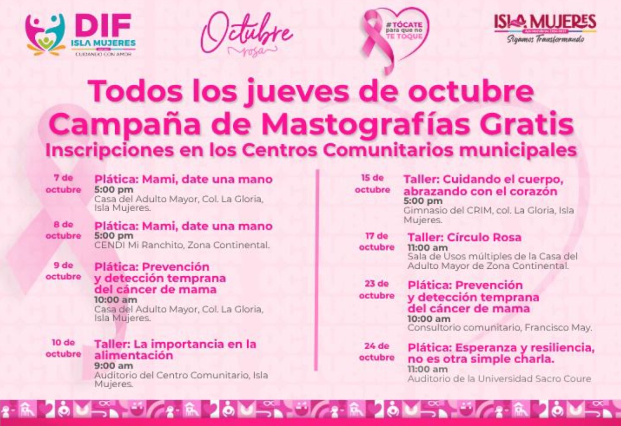 Isla Mujeres, Quintana Roo a 02 de octubre de 2025.- El Gobierno Municipal que encabeza la alcaldesa Atenea Gómez Ricalde, a través del Sistema para el Desarrollo Integral de la Familia (DIF) Isla Mujeres, anunció una nutrida agenda de actividades en el marco del Mes Rosa, como parte de la Campaña “Tócate para que no te toque”, que busca sensibilizar a la comunidad isleña sobre la importancia que tiene la detección oportuna del cáncer de mama.