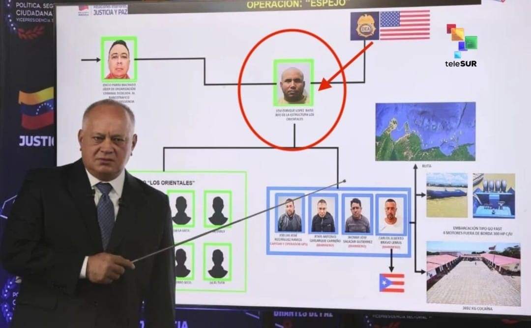 El ministro afirmó que las autoridades estadounidenses intentan crear una narrativa falsa que vincula a Venezuela con el narcotráfico, narrativa que calificó de “falsa y manipulada”, afirmando que uno de los arrestados en el operativo fue Levi Enrique López, quien, según Cabello, “es agente de la DEA y narcotraficante”. “Básicamente, lo que pretenden es sembrar droga en una embarcación venezolana. Están condenando a muerte a pescadores caribeños”, declaró.Añadió que durante el operativo, miembros de la Fuerza Armada Nacional Bolivariana (FANB), que contaban con información previa de agencias de inteligencia, esperaron durante 20 horas a que pasara la pequeña embarcación procedente de La Guajira, Colombia, antes de ser interceptados.La droga provenía de Colombia, por lo que el ministro instó a la administración Trump a monitorear los cargamentos que salen por el océano Pacífico hacia Estados Unidos y Europa. También mencionó que se han detectado cargamentos de droga en exportaciones de banano vinculadas a Ecuador y a la familia del presidente Daniel Noboa.La familia Noboa es una de las mayores exportadoras de banano del país, un método de contrabando común con o sin el conocimiento de las empresas exportadoras debido al gran volumen de envíos de banano desde Ecuador a Estados Unidos y Europa.