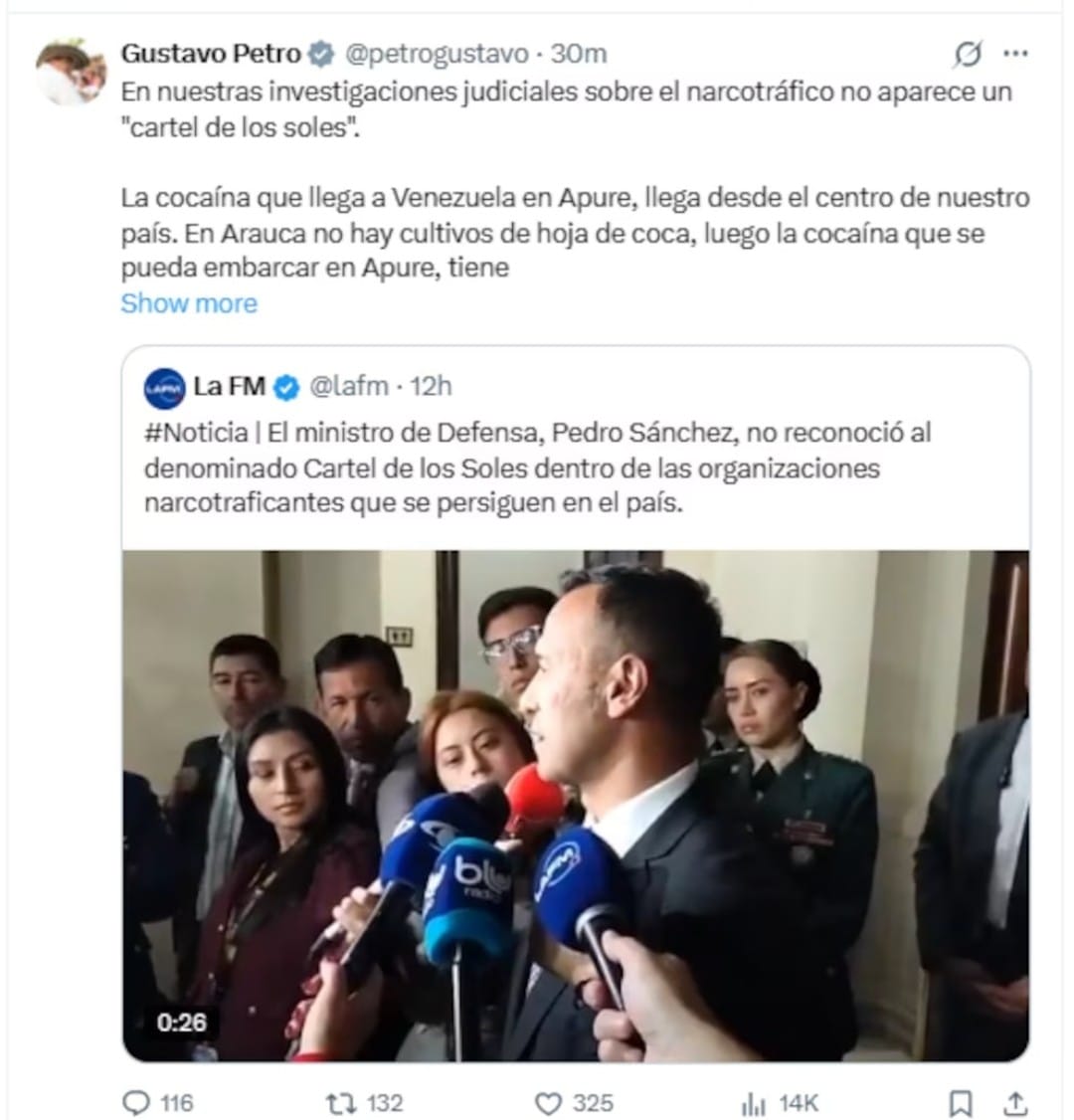 Pero el presidente colombiano afirma que se trata de grupos de sicarios urbanos. Por ello, publicó un extenso mensaje en sus redes sociales en el que no solo negó la existencia de esta red criminal, cuyo líder, según Washington, es el propio Maduro, sino que también afirmó que el narcotráfico en la frontera con Venezuela es obra de grupos armados que operan allí.