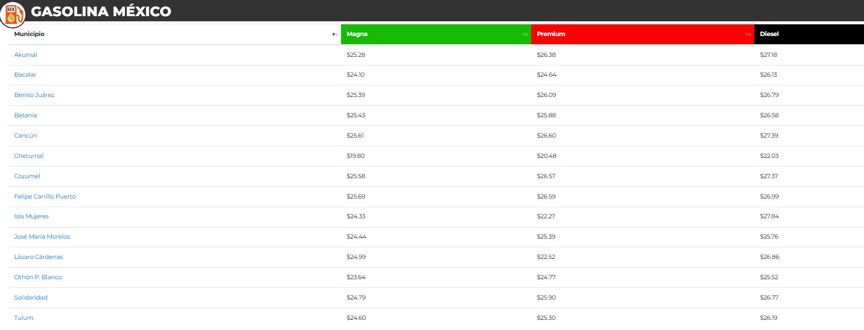 Y en Felipe Carrillo Puerto, se indica que el precio promedio de la Magna es 25.69 pesos, el de la Premium es de 26.59 pesos y el del diésel, 26.99 pesos.