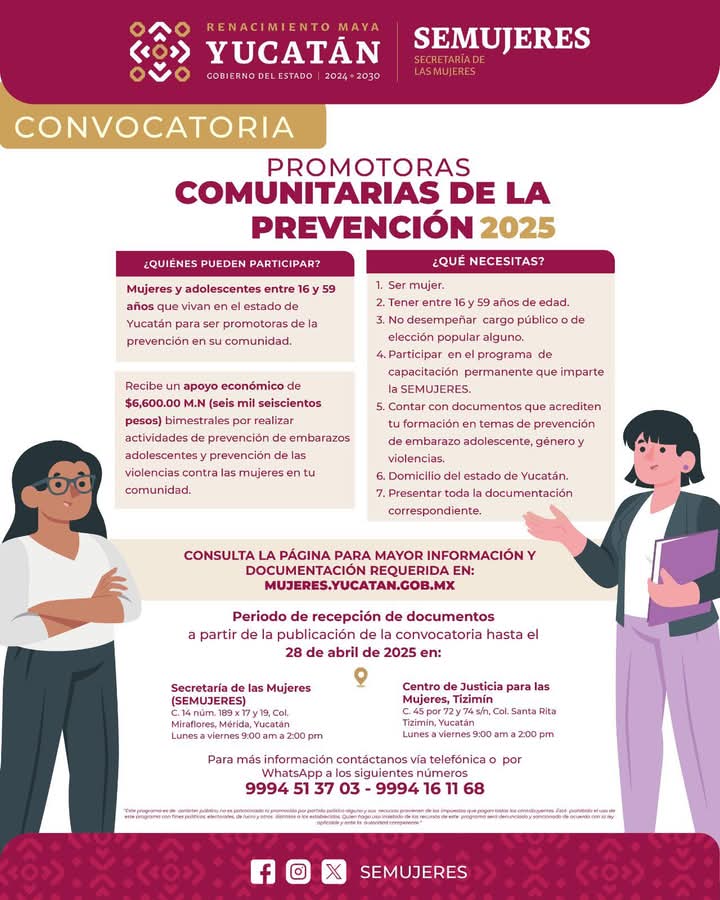 Tizimín, Yuc. a 01 de abril de 2025.El Gobierno del Estado a través de la Secretaría de las Mujeres Yucatán lanza la convocatoria Promotoras Comunitarias de la Prevención 2025. Se otorgará un apoyo económico bimestral de $6,600 pesos para participar en acciones de prevención de embarazos adolescentes y violencias contra las mujeres.