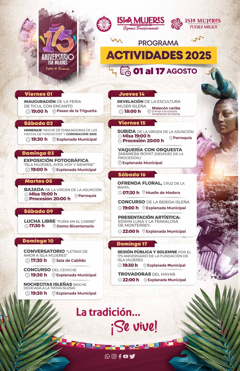 Finalmente, el domingo 17, a las 19:30 horas, se celebrará la Sesión Pública y Solemne por el 175 aniversario de la fundación de Isla Mujeres. La música continuará a las 22:00 horas con la presentación de Trovadoras del Mayab, que llenarán de romanticismo y tradición el corazón del pueblo.