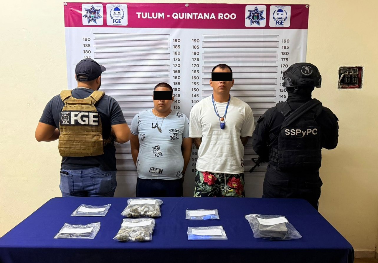 En un segundo hecho, Dylan Humberto “N” y Luis Enrique “N” fueron detenidos sobre la carretera Tulum–Boca Paila, a la altura del kilómetro 7. A ellos se les aseguraron dosis de marihuana y polvo blanco granulado con características de la droga conocida como “cristal”.