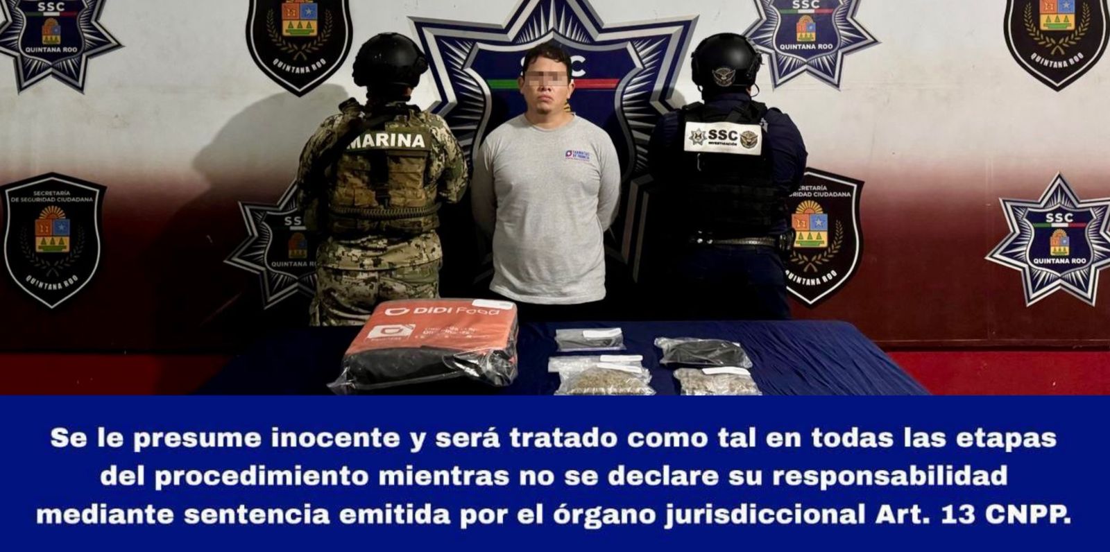 Al momento de su detención, se le decomisó una mochila tipo lonchera con la leyenda Didi Food, una mariconera, ocho dosis de marihuana junto con una bolsa a granel del mismo vegetal, y 23 dosis de fragmentos sólidos con características de crack.