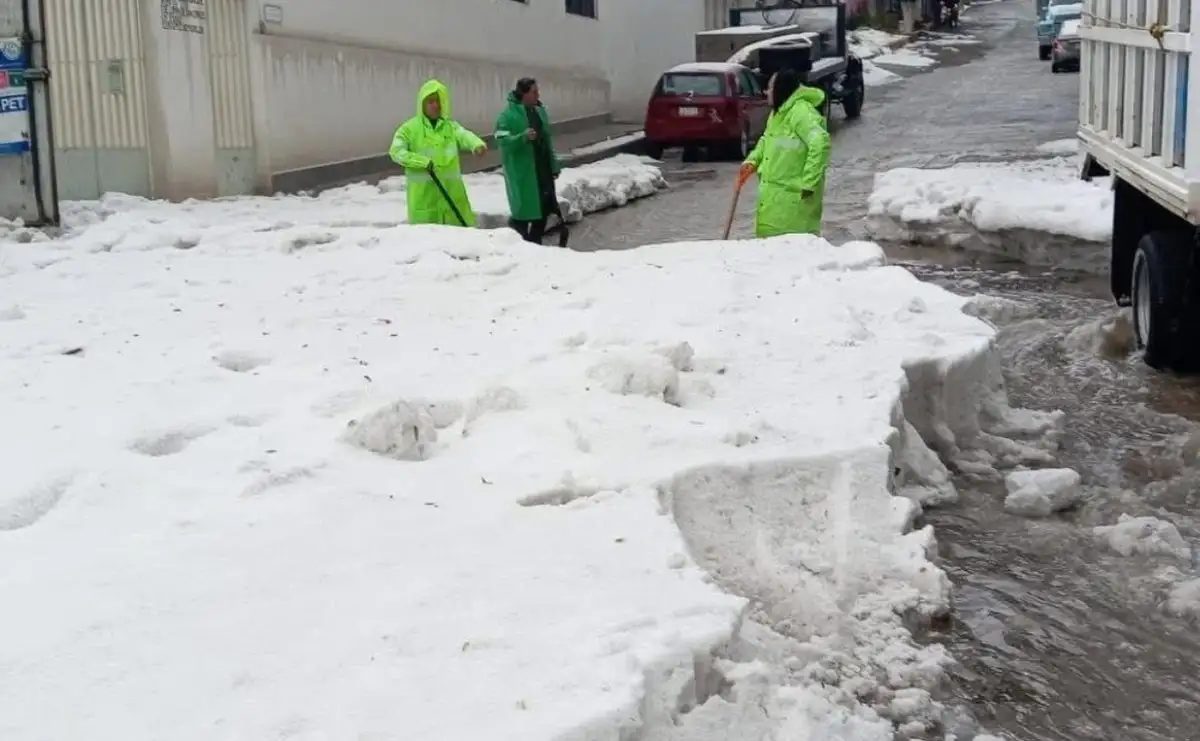 En calles aledañas el granizo alcanzó entre los 70 centímetros y el metro de espesor, por lo que inmediatamente, elementos de protección civil municipal activaron el protocolo de auxilio y comenzaron a hacer labores de limpieza.