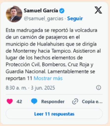 En sus redes sociales el gobernador Samuel García Sepúlveda, comentó “esta madrugada se reportó la volcadura de un camión de pasajeros en el municipio de Hualahuises que se dirigía de Monterrey hacia Tampico. Asistieron al lugar de los hechos elementos de Protección Civil, Bomberos, Cruz Roja y Guardia Nacional”.