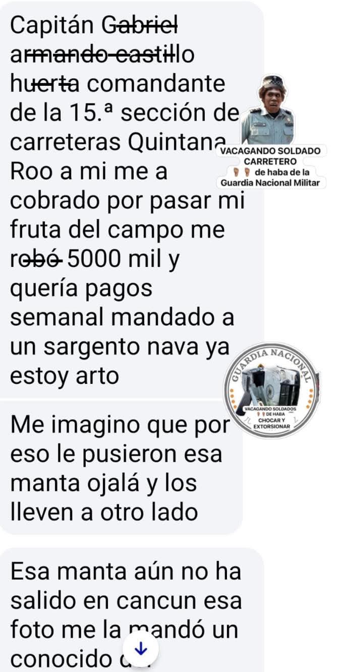 “Se fue la rata y llegó la ratota mayor el coordinador de la Guardia Nacional de Camino, el Capitán Armando Castillo Huerta y su gato el Sargento Nava que anda extorsionando aquí en Cancún, haciéndose pendejos que no hacen nada. No estás cumpliendo con mis tratos, o me devuelves mi dinero que te doy quincenal a ti y tu gato o les va a llevar su puta madre. Este es el primer y último aviso que les doy ratas” (sic).