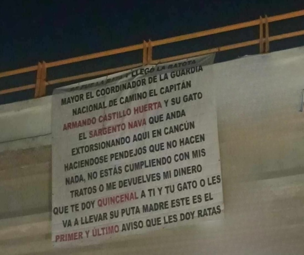 “Se fue la rata y llegó la ratota mayor el coordinador de la Guardia Nacional de Camino, el Capitán Armando Castillo Huerta y su gato el Sargento Nava que anda extorsionando aquí en Cancún, haciéndose pendejos que no hacen nada. No estás cumpliendo con mis tratos, o me devuelves mi dinero que te doy quincenal a ti y tu gato o les va a llevar su puta madre. Este es el primer y último aviso que les doy ratas” (sic).