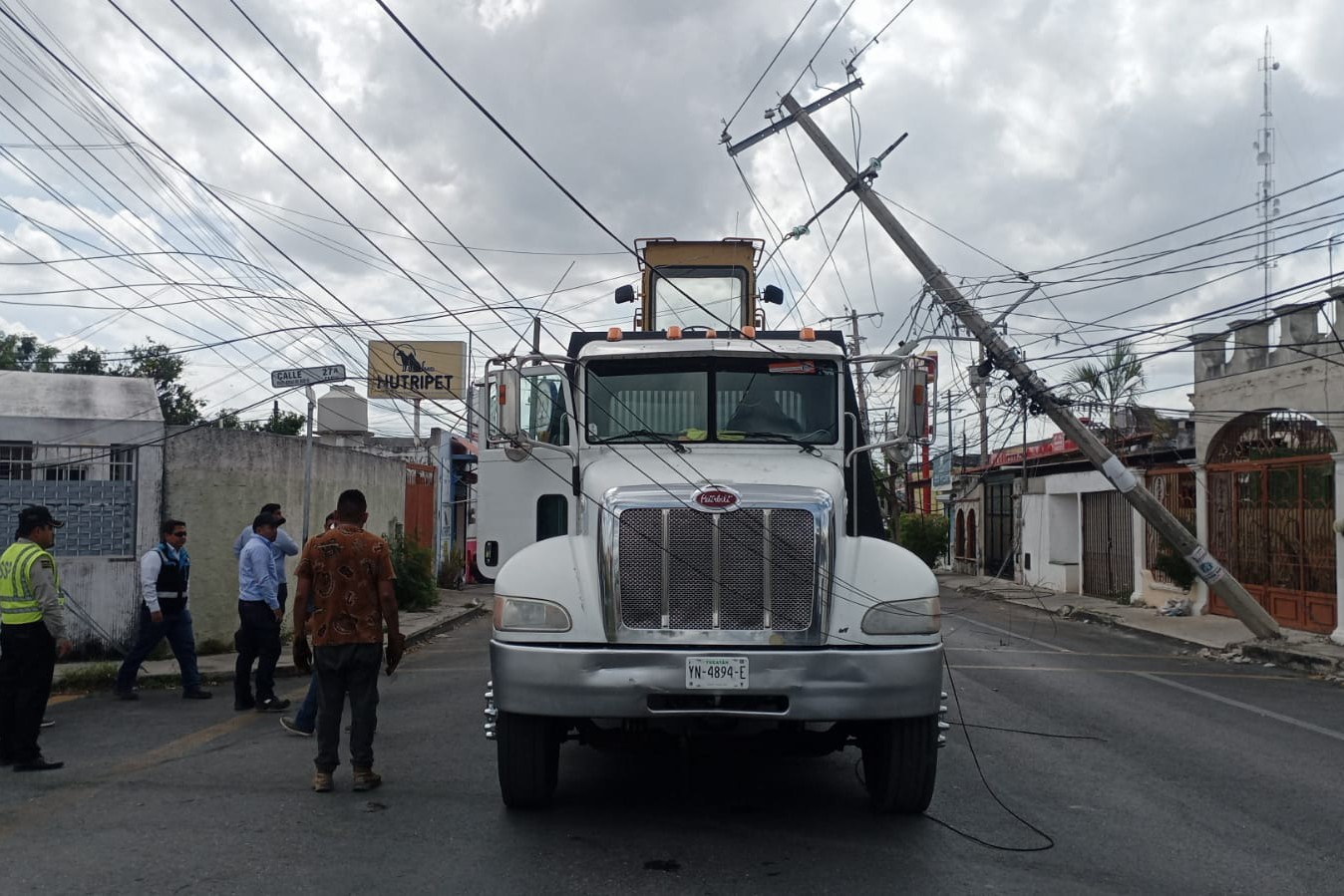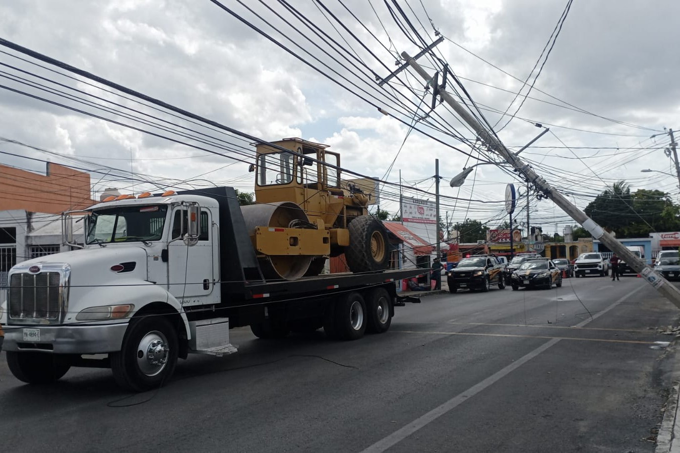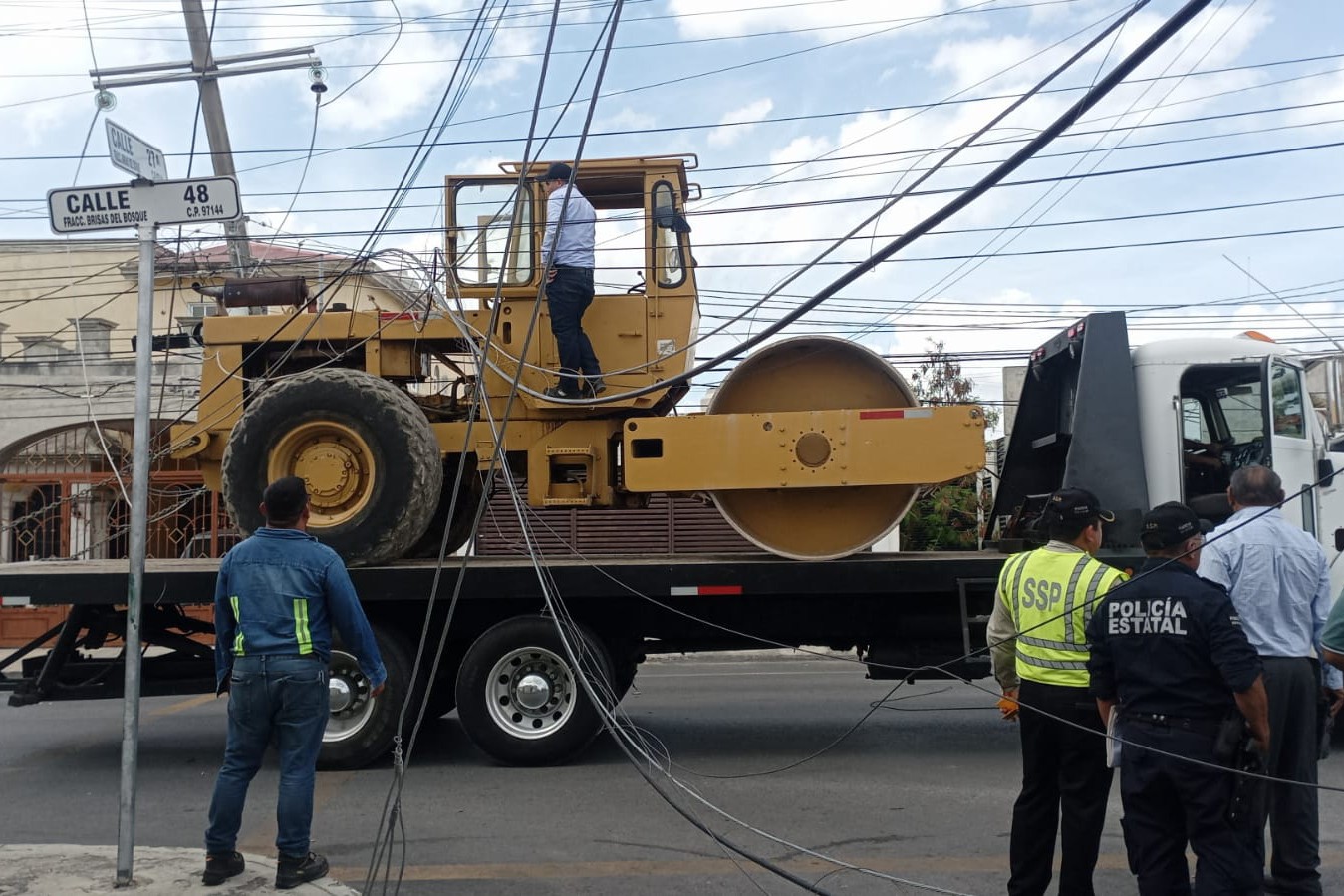 MÉRIDA, YUC.- 10 de febrero.- Agentes de la SSP tuvieron que cerrar la calle 48 con 27-A del fraccionamiento Brisas del Bosque, luego de que la parte más alta de una aplanadora que era llevada por una grúa, se atoró en cables, reventó algunos y casi derriba un poste de la CFE que quedó solo sostenido por los cables.
