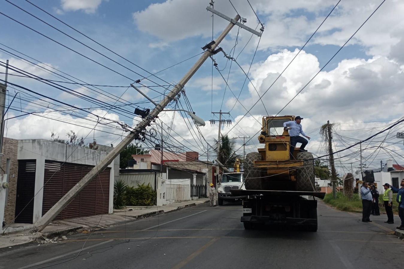 MÉRIDA, YUC.- 10 de febrero.- Agentes de la SSP tuvieron que cerrar la calle 48 con 27-A del fraccionamiento Brisas del Bosque, luego de que la parte más alta de una aplanadora que era llevada por una grúa, se atoró en cables, reventó algunos y casi derriba un poste de la CFE que quedó solo sostenido por los cables.