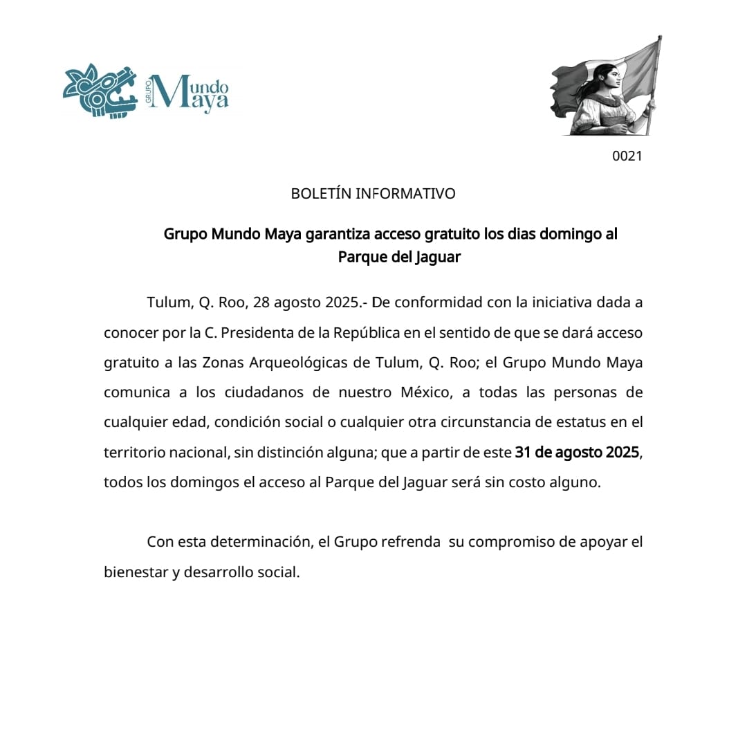 TULUM a 28 de agosto .— A partir de este domingo 31 de agosto, el acceso al Parque del Jaguar será gratuito todos los domingos, informó el Grupo Mundo Maya, en cumplimiento con la iniciativa anunciada por la presidenta de la República para garantizar entrada libre a las zonas arqueológicas de México, aunque cabe señalar que se trata de una obligación que ya está establecida en ley, pero se había dejado de cumplir en Tulum desde el establecimiento de los cobros de entrada al parque administrado por el Ejército Mexicano.