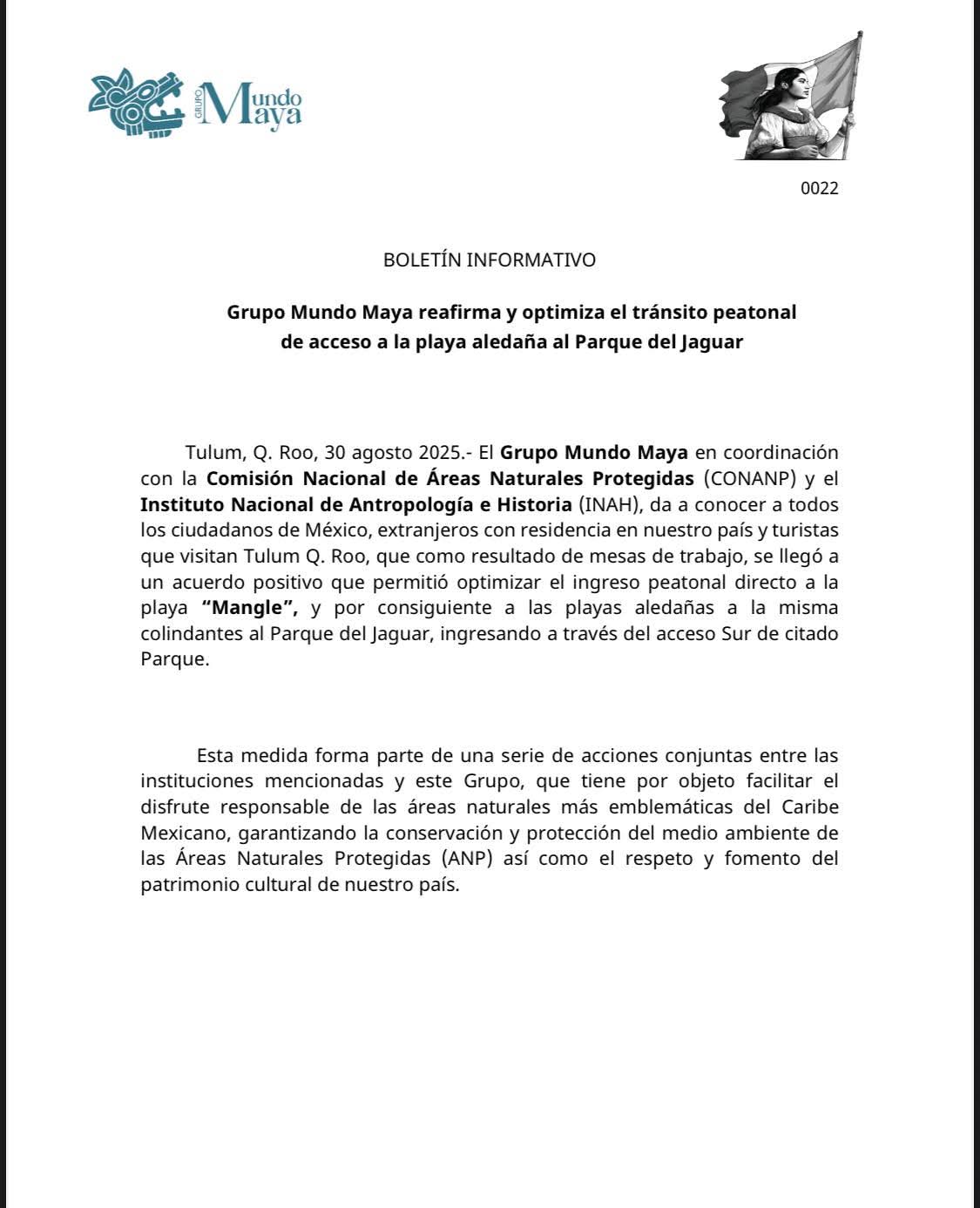 En el boletín 0022, el Grupo Mundo Maya destacó que la apertura del ingreso peatonal por el acceso sur forma parte de una estrategia integral para facilitar el “disfrute responsable” de las playas y áreas naturales, reiterando su compromiso con la conservación de las Áreas Naturales Protegidas (ANP).