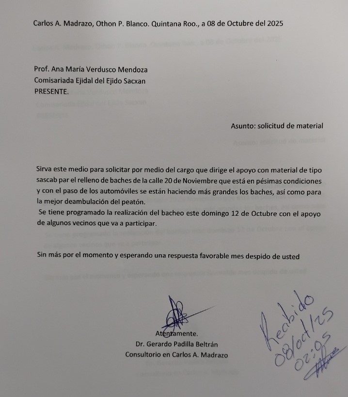 En un oficio fechado el 8 de octubre de 2025, el doctor Gerardo Padilla Beltrán, en representación de los vecinos del poblado, solicitó apoyo a la Comisariada Ejidal del Ejido Sacxán, profesora Ana María Verduzco Mendoza, para la entrega de material tipo sascab destinado al relleno de los baches en la calle 20 de Noviembre, la cual se encuentra en condiciones deplorables y representa un riesgo tanto para automovilistas como para peatones.
