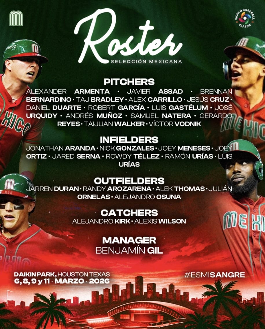 CANCÚN, Q. ROO a 5 de febrero 2026.- A exactamente 29 días de que la Selección Mexicana debute en el -VI Clásico Mundial de Beisbol-, el mánager dd equipo -Tricolor- Benjamín Gil, hizo público el roster oficial para dicho certamen, mismo que será integrado por 30 jugadores, entre los que aparece una vez más el receptor de los Tigres de Quintana Roo, Alexis Wilson, así como el lanzador zurdo Alexander Armenta, de estirpe bengalí y quien actualmente juega en la pelota japonesa.