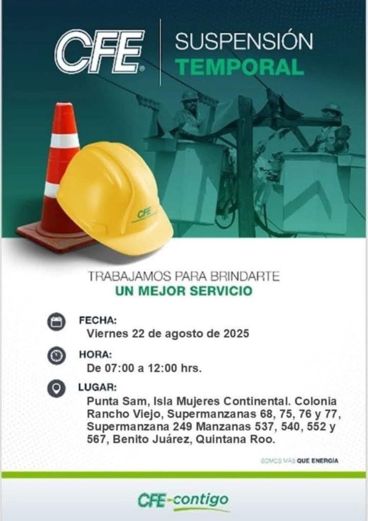 La Comisión Federal de Electricidad (CFE) informó sobre una suspensión temporal del suministro de energía eléctrica que se llevará a cabo el próximo viernes, 22 de agosto de 2025 en distintas zonas de Cancún e Isla Mujeres Continental.
