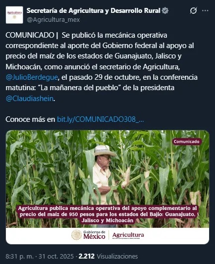 Ante los bloqueos realizados en los últimos días por productores de maíz para exigir mejores condiciones económicas, el Gobierno de México, a través de la Secretaría de Agricultura y Desarrollo Rural (Sader), dio a conocer la mecánica para sostener el precio del grano y evitar pérdidas entre los pequeños agricultores de Jalisco, Guanajuato y Michoacán.