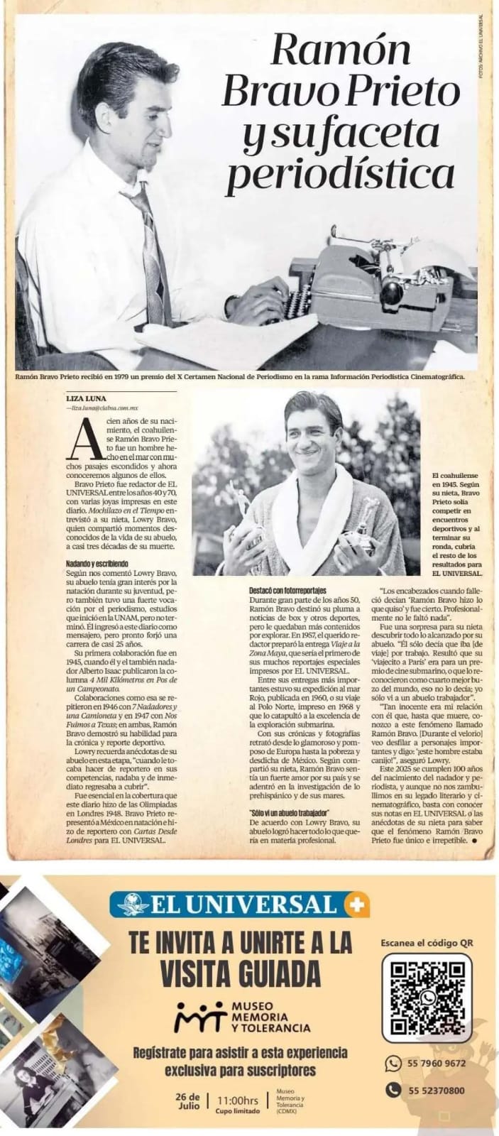 Ramón Bravo Prieto (1925-1998) es el buzo mexicano que mayor renombre ha alcanzado a nivel internacional. En el auge profesional de ambos, entabló una amistosa relación científica con el investigador submarino francés, Jacques Cousteau. Fue merecedor del Premio Nacional de Periodismo por su divulgación científica de la riqueza mexicana, en la pantalla chica. Su visionaria labor en defensa de los ecosistemas marinos dio origen a la Medalla Ramón Bravo, que otorga el Gobierno de Quintana Roo.