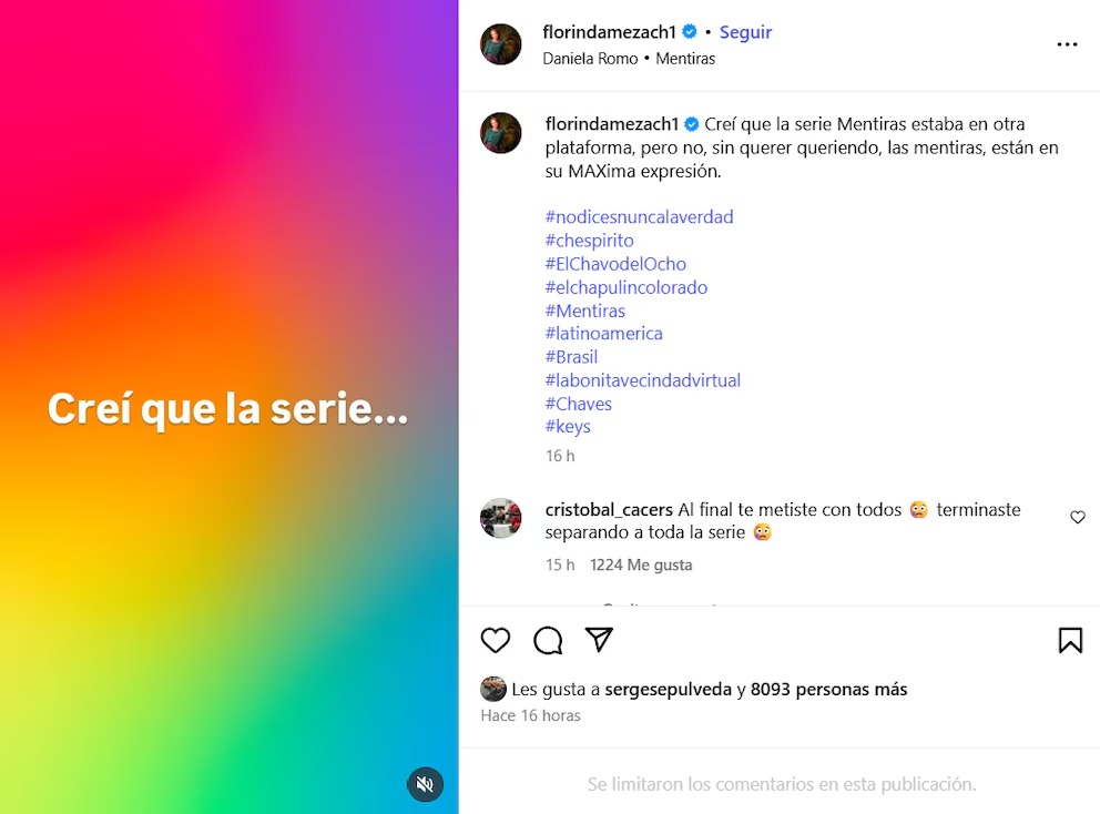 Según la trama, la infidelidad entre Gómez Bolaños y Meza provocó la salida de Carlos Villagrán y Enrique Segoviano, quien entonces era pareja sentimental de Meza. Las reacciones no tardaron en llegar. En su cuenta de Instagram, Meza escribió: “Creí que la serie Mentiras estaba en otra plataforma, pero no, sin querer queriendo, las mentiras están en su MAXima expresión”.