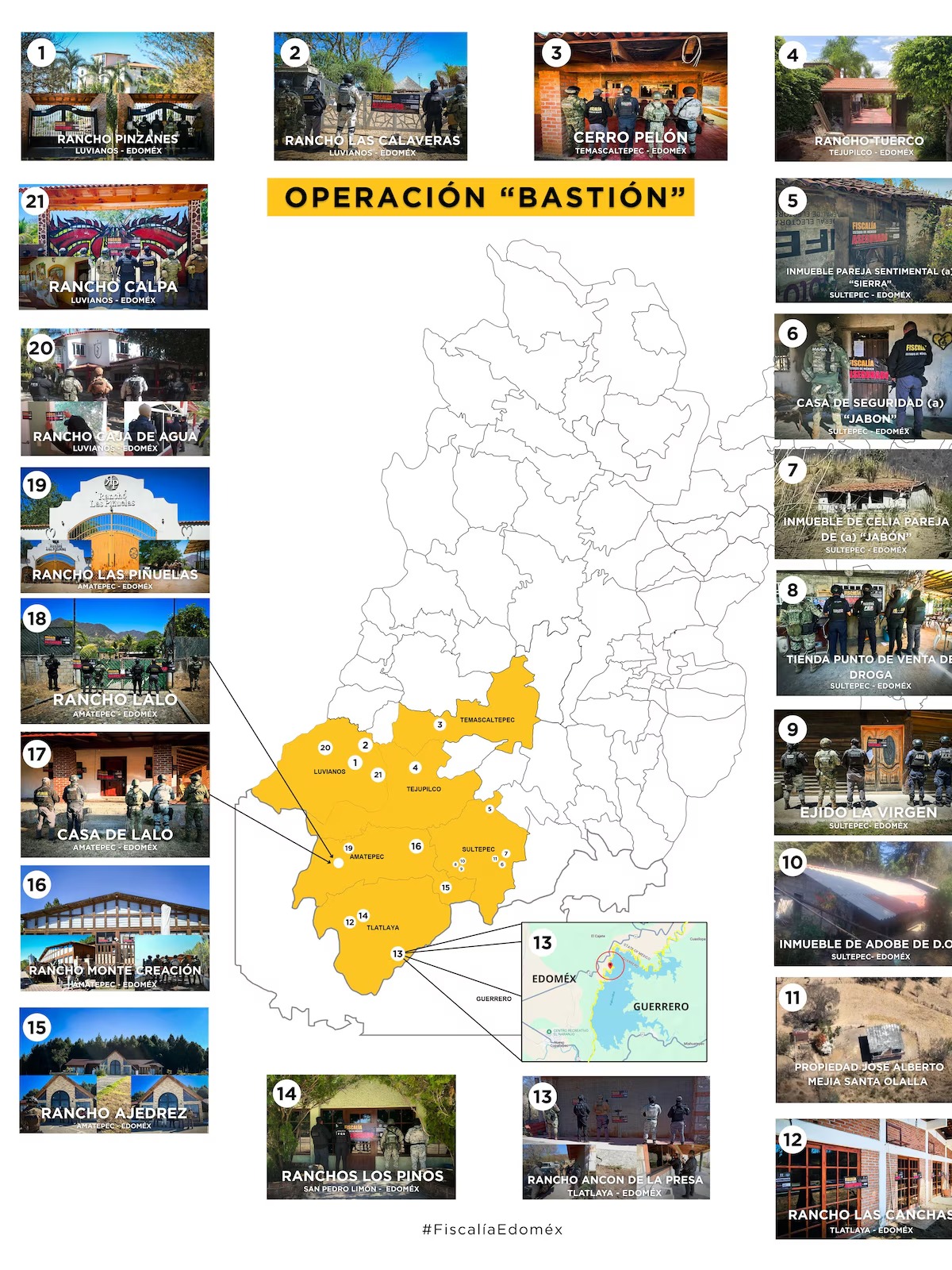 Según informó la Fiscalía General de Justicia del Estado de México (FGJEM), estos inmuebles, que incluyen ranchos, fincas y casas de seguridad, eran utilizadas por integrantes de la Familia Michoacana para resguardo, vigilancia y actividades ilícitas como el trasiego de drogas y el secuestro.