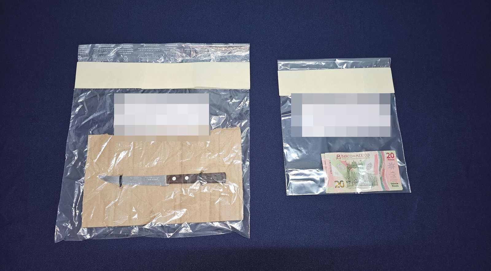 Durante la revisión, se le encontró un cuchillo de aproximadamente 20 centímetros de largo y ochenta pesos en efectivo, producto del atraco.