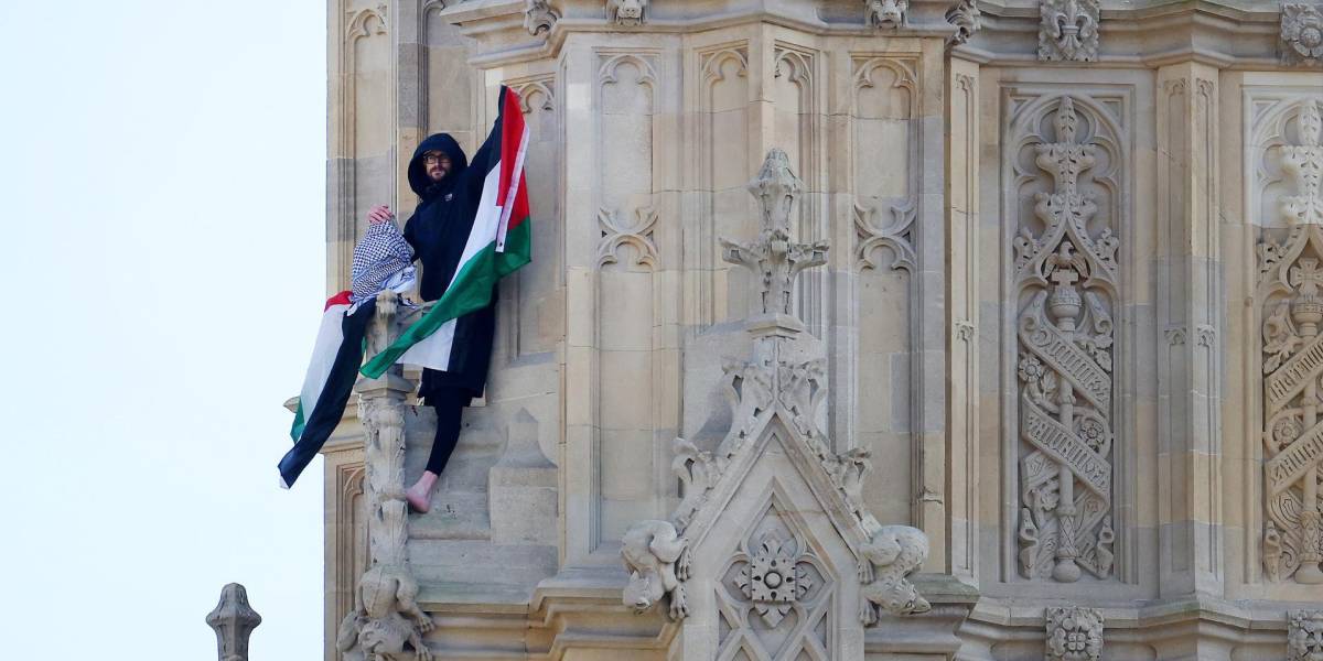 Un hombre fue arrestado la madrugada del domingo después de escalar la torre del Big Ben en el Palacio de Westminster, en el centro de Londres, descalzo y sosteniendo una bandera palestina.