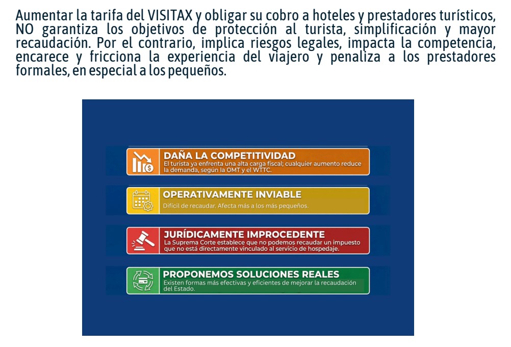 También señalan que dispersar la cobranza entre pequeños hoteles, hoteles, plataformas y anfitriones multiplica riesgos de cobros indebidos, confusión y fricciones con el visitante, y que los pequeños hoteles y anfitriones no cuentan con la infraestructura ni recursos para llevar la tarea de retención.