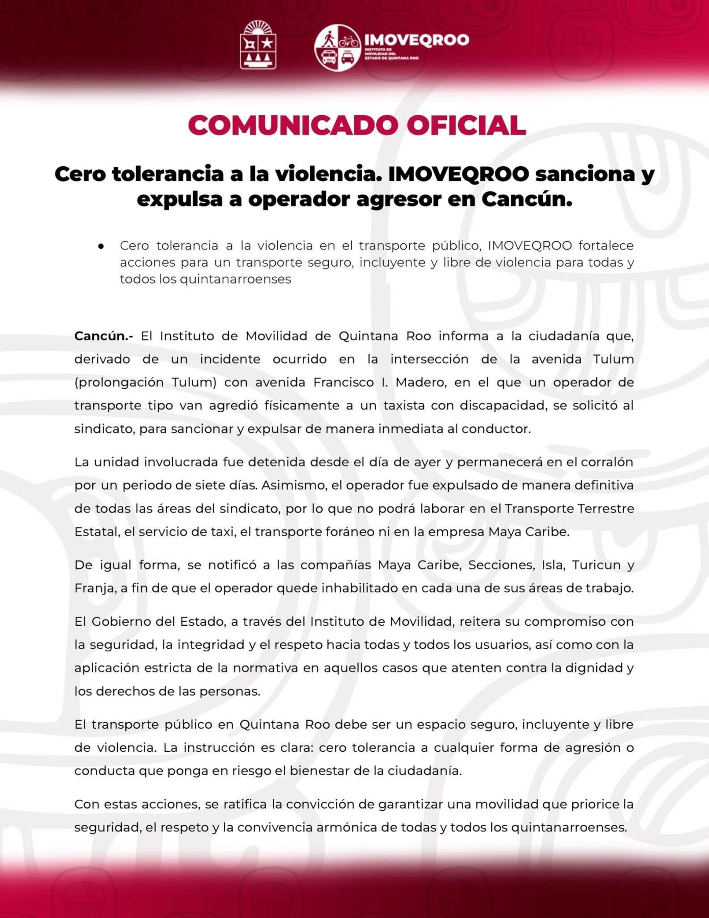 El Instituto de Movilidad de Quintana Roo (IMOVEQROO) aplicó sanciones inmediatas contra un operador de transporte público que agredió físicamente a un taxista con discapacidad en la intersección de la avenida Tulum con Francisco I. Madero.