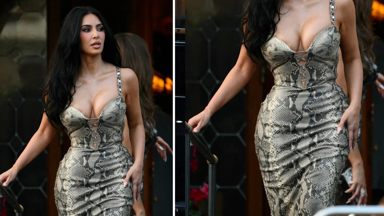 Kim Kardashian se apodera de Venecia con un vestido de estampado de serpiente en la boda de Jeff Bezos: