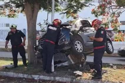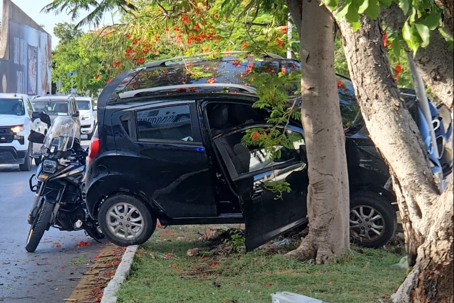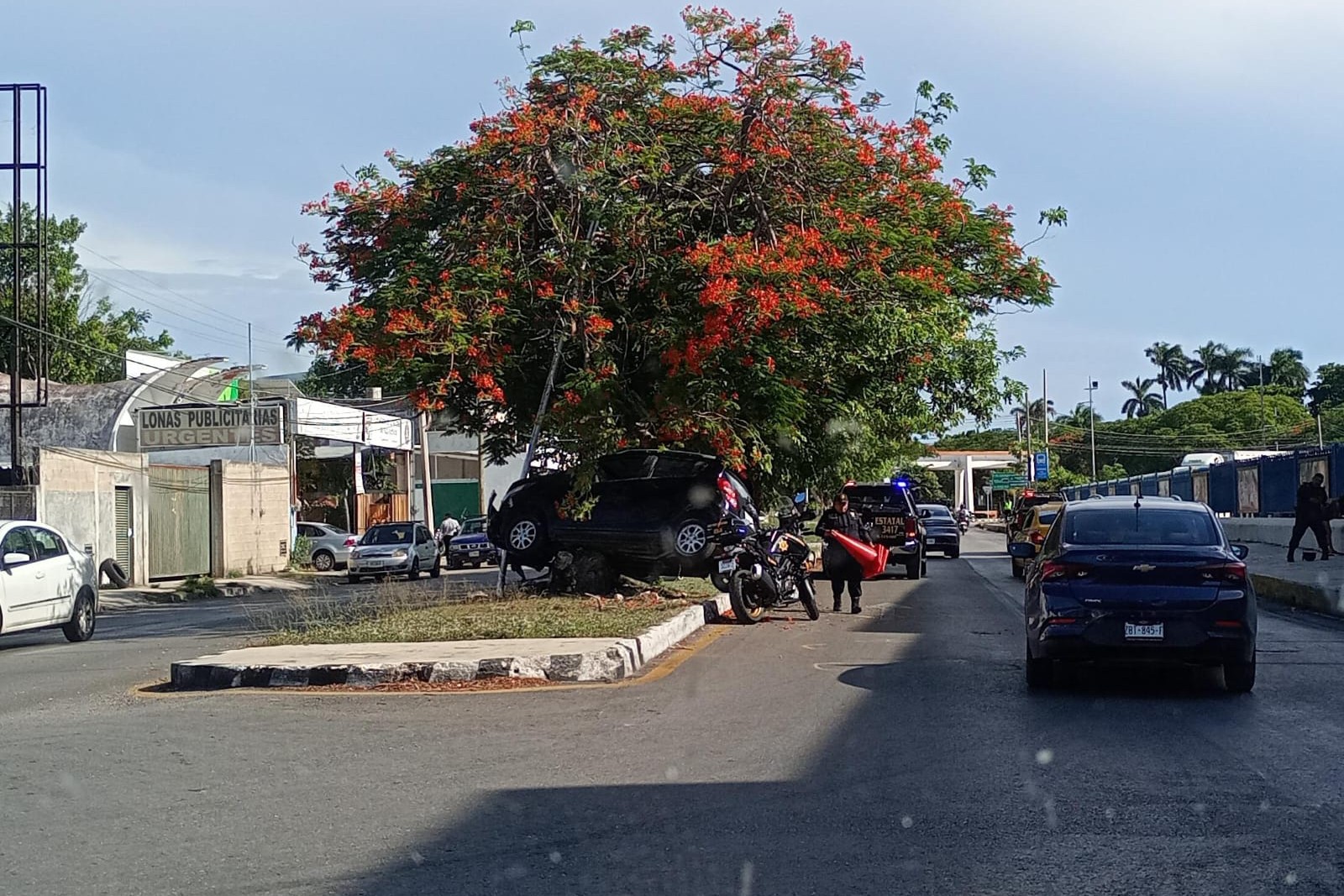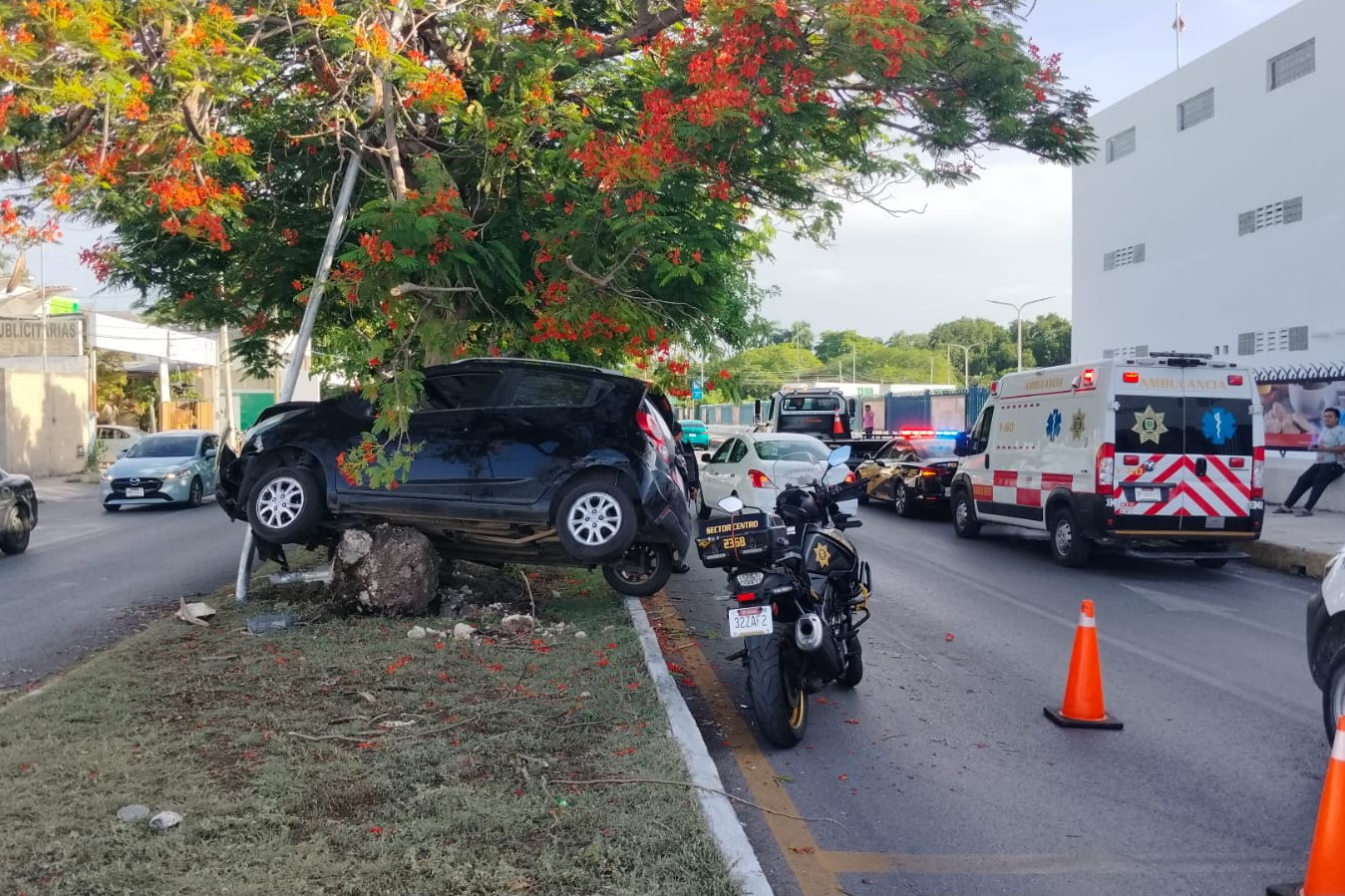 MÉRIDA, YUC.- 29 de julio.- Impresionante accidente ocurrió a un costado de la galletera Dondé, sobre Circuito Colonias, en el cual un auto Spark chocó y derribó un poste de alumbrado público, y quedó montado sobre la base de concreto de éste, encima del camellón.