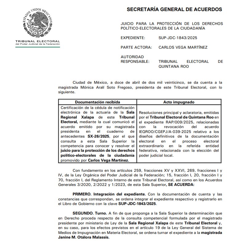 La Sala Superior recibió el mismo 12 de abril y lo marcó en el número de expediente SUP-JDC-1843-2025, primero para decidir si atrae el caso.