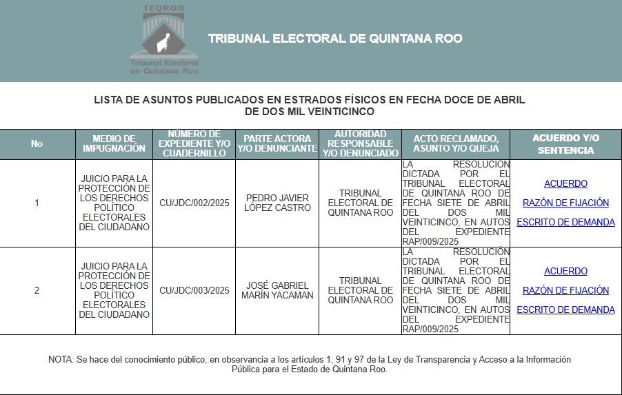 Pero también llama la atención que el Teqroo, en enésimo acto irregular, ocultó las demandas al público en lugar de hacerlas públicas por 72 horas como le manda la ley, pues aunque en sus estrados dio a conocer el aviso de que se presentaron las demandas de los dos primeros abogados, en los vínculos a los documentos del acuerdo de recepción, razón de fijación en estrados y a los escritos de demanda no existe contenido, y todo indica que es porque decidieron adrede desactivar los vínculos para que los interesados en consultarlos no puedan encontrar nada.