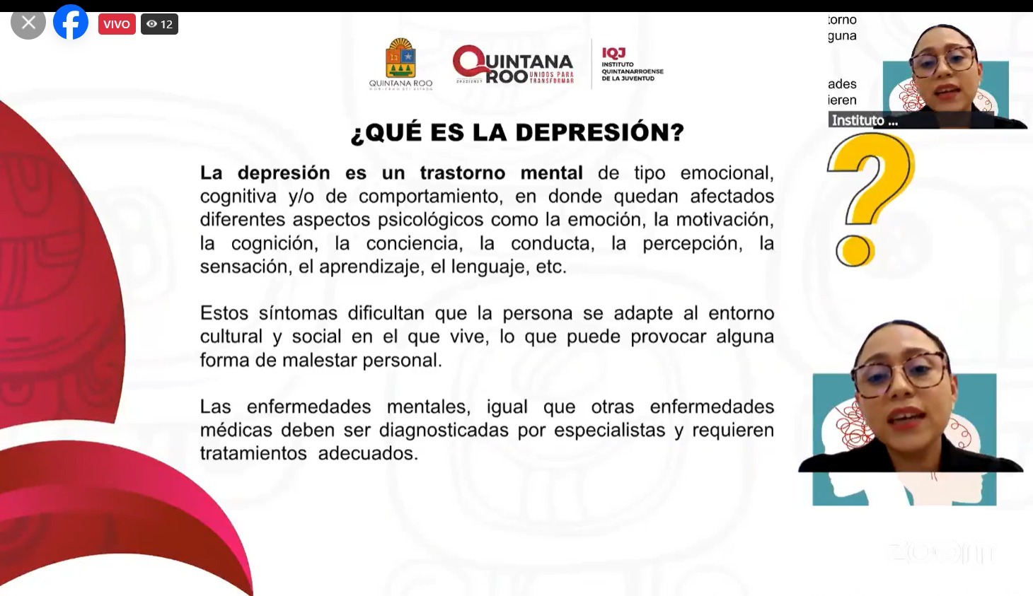 Chetumal.- Con el objetivo de proporcionar a las y los jóvenes herramientas y conocimientos prácticos que les permita identificar factores de riesgo, fomentar hábitos saludables y desarrollar habilidades emocionales para prevenir la depresión, el Instituto Quintanarroense de la Juventud (IQJ) que encabeza Alma Alvarado Moo, llevó a cabo el webinar “Aprendiendo a Prevenir la Depresión”.