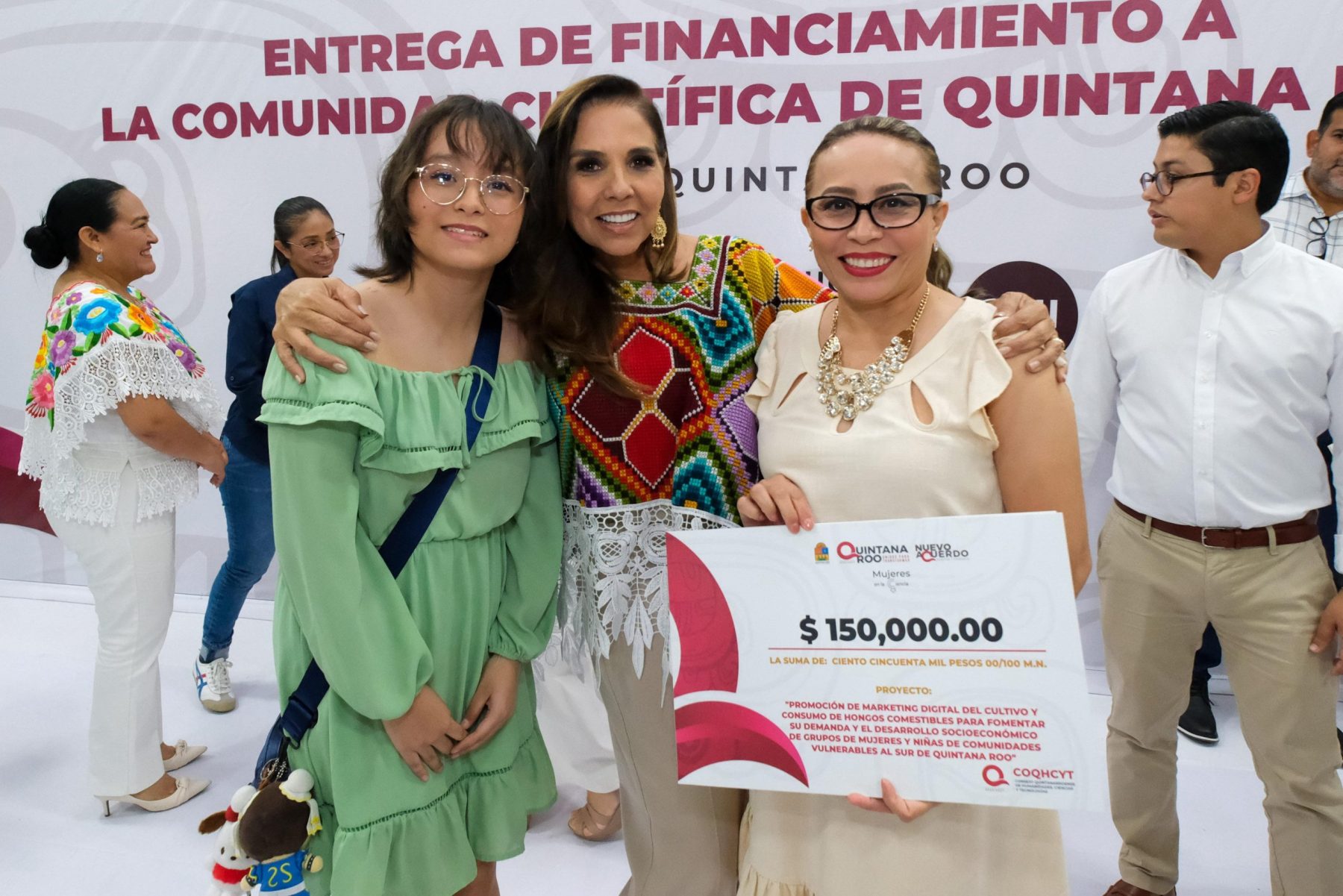 Acompañada de la presidenta honoraria del DIF Quintana Roo, Verónica Lezama Espinosa, y del director general del COQHCYT, Cristopher Malpica Morales, la gobernadora de Quintana Roo entregó cheques del Programa “Mujeres en la Ciencia 2025”, a las responsables técnicas de 10 proyectos de investigación seleccionados mediante convocatoria pública. Cada iniciativa fue apoyada con un monto de 150 mil pesos, lo que representa una inversión total de 1 millón 150 mil pesos y un impacto directo en 72 mujeres que integran los grupos de trabajo.