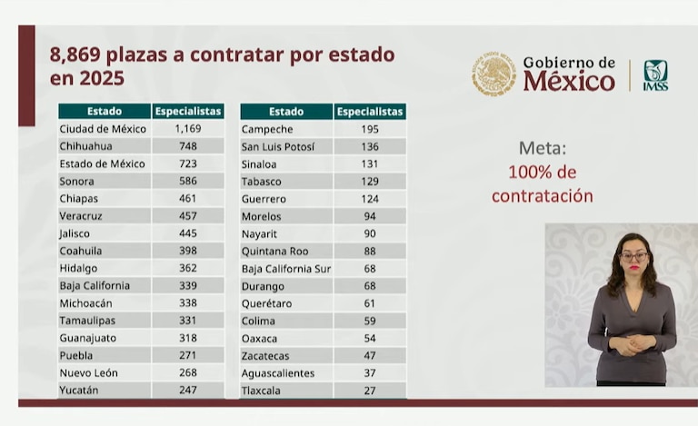 En cuanto a las especialidades, el director general del IMSS declaró que el 53 por ciento de las contrataciones se concentrarán en seis especialidades troncales, en las que destacan la medicina familiar, medicina de urgencias, medicina interna.