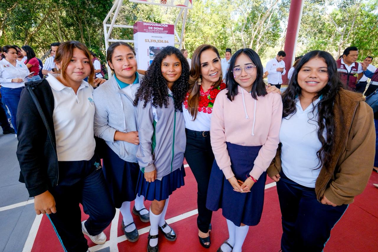 Rancho Viejo, Isla Mujeres.- Al inaugurar el nuevo domo del Colegio de Bachilleres, plantel Ciudad Mujeres, la gobernadora Mara Lezama Espinosa destacó ante las y los estudiantes la importancia de cumplir la palabra, los compromisos, y hoy se cumple la promesa de entregar un domo.