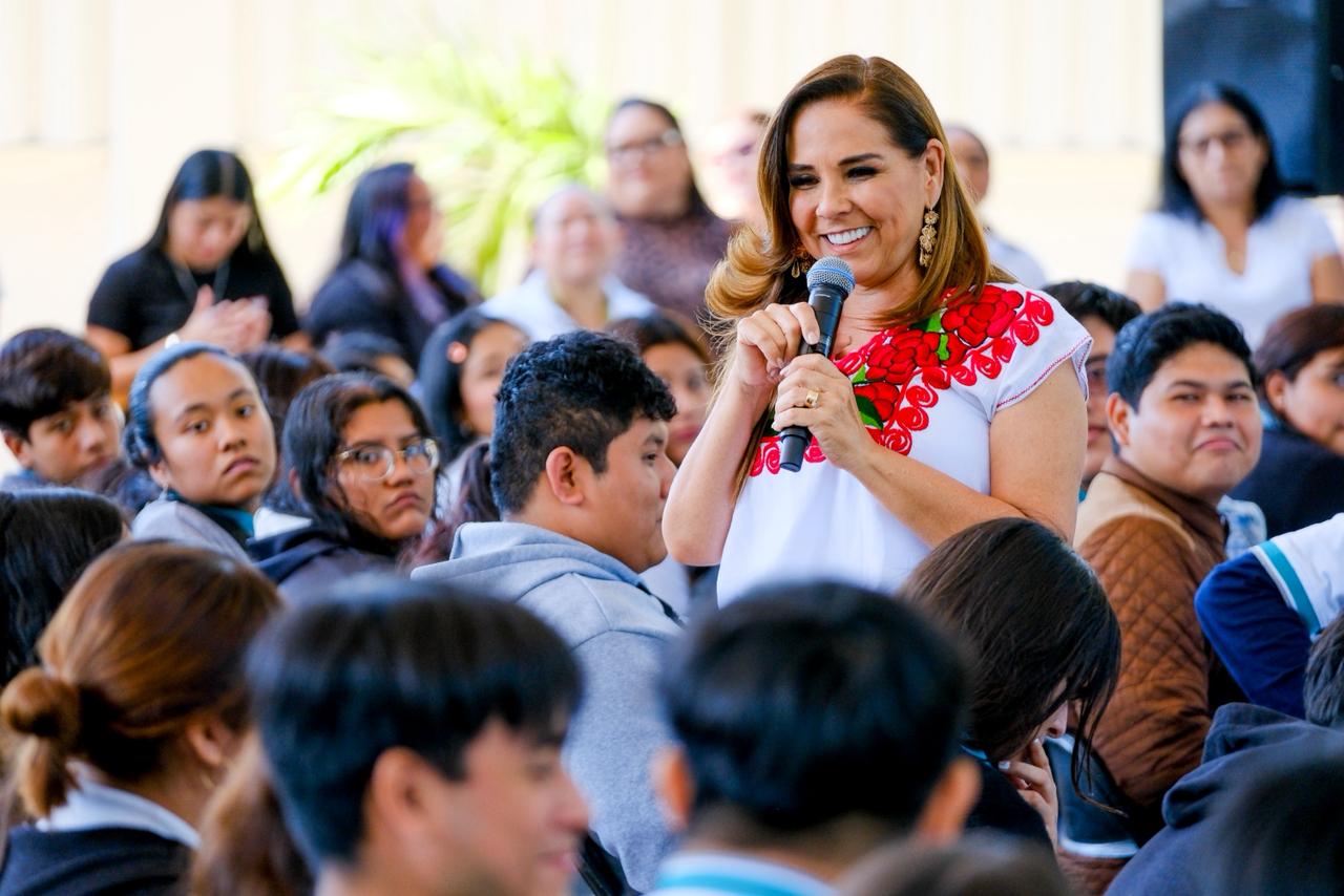 Acompañada de la presidenta municipal Atenea Gómez Ricalde, la titular del Ejecutivo reafirmó el compromiso de este gobierno humanista con corazón feminista, con una educación incluyente y con bienestar para las y los jóvenes de la zona continental de Isla Mujeres.