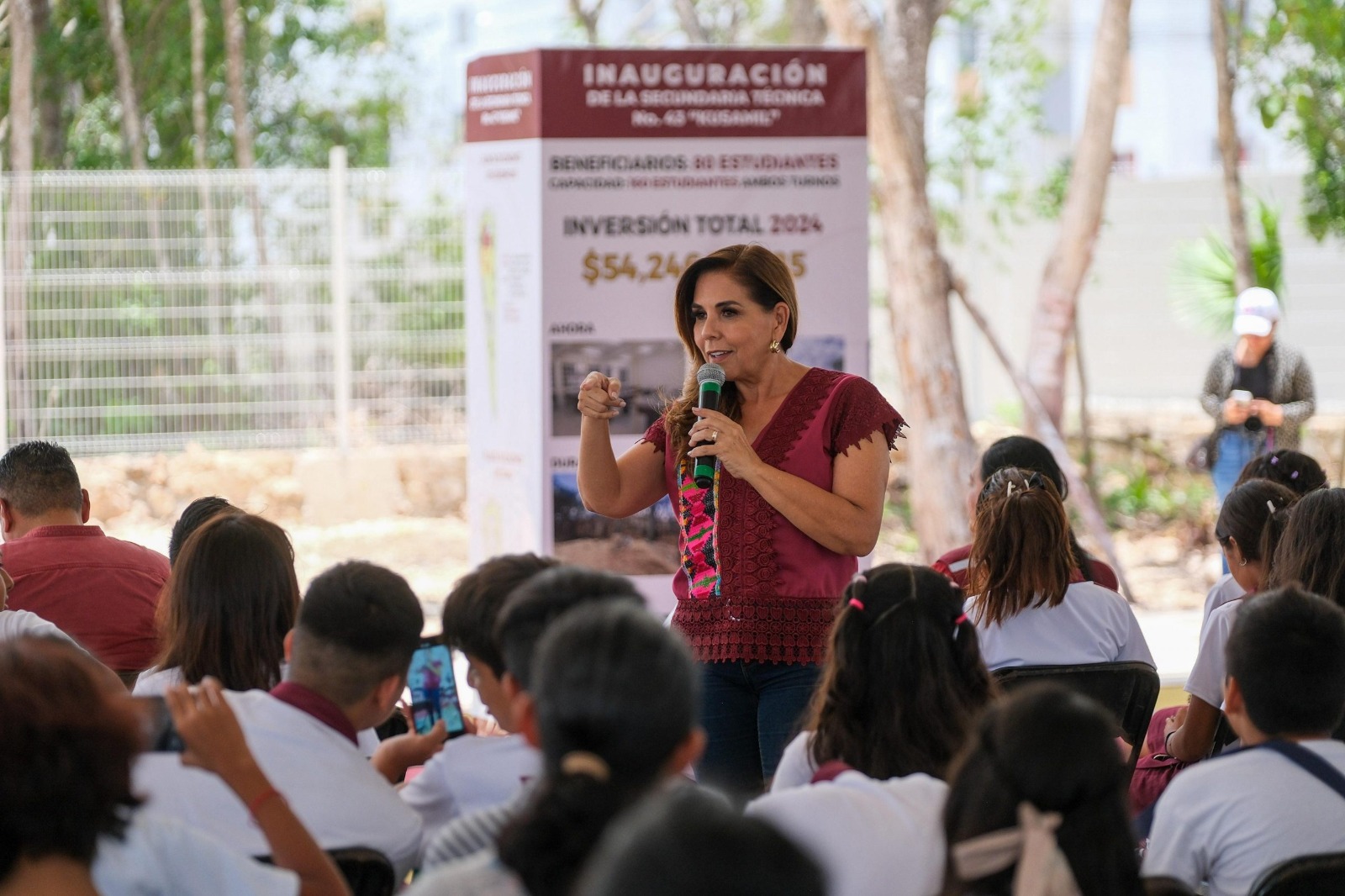 Cancún.- “Construir una escuela no es cualquier cosa, es abrir la puerta a nuevas oportunidades, es darles un espacio donde puedan aprender, convivir, crecer; donde puedan soñar en grande y llegar tan alto como se lo propongan” expresó la gobernadora Mara Lezama Espinosa ante alumnos de la secundaria técnica número 43 “Kusamil”, en Cancún, quienes están estrenando edificio.