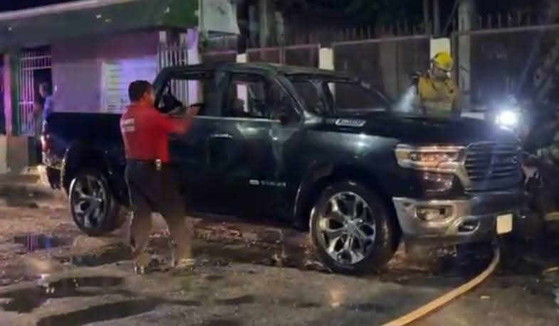 El vehículo al que le fue prendido fuego de manera deliberada, resultó en pérdida, es una camioneta del año –una Dodge RAM 1500 negra, placas YP-2776-D del estado de Yucatán– de Alberto Santini, propietario de las taquerías “El Campechano Jr.”, tras ser consumida por el fuego.