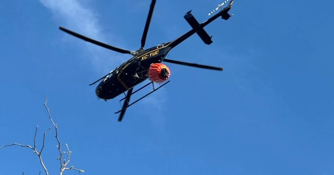 Un helicóptero Bell-429 de la SSP Yucatán estuvo realizando descargas de agua en las zonas más difíciles de alcanzar, mediante una canastilla aérea.