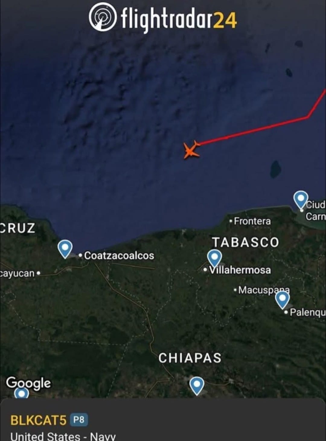 En la jornada del viernes de la semana pasada, aproximadamente a la media noche un avión de la marina de Estados Unidos, un P8 -A poseidon ( avión de rastreo y guerra submarina ) volo sobre los límites de la costa mexicana, desde Yucatán hasta Veracruz .