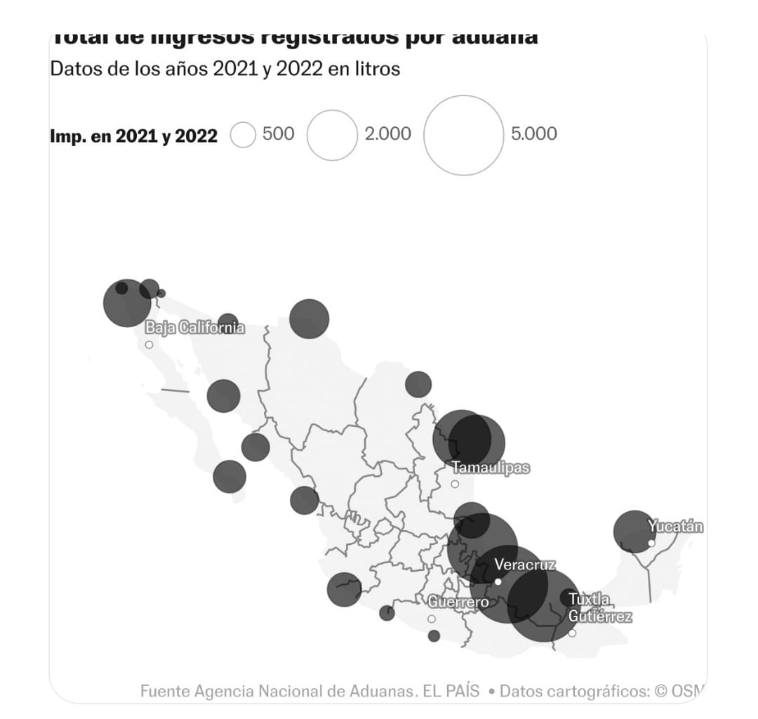 La aduana terrestre de Ciudad Reynosa pasó de registrar la importación de 81 millones de litros de aceites a 1.885 millones de litros en solo un año. Veracruz es otro punto de interés. Coatzacoalcos, una ciudad petrolera de Veracruz, pasó de importar ocho millones a 2.267 y 1.911 millones en 2021 y 2022. En Tuxpan, en el mismo Estado, también se fueron de ocho a 1.900 millones cada año. Y la aduana del puerto de Veracruz pasó de 652.000 litros a 2.500 y 2.200 millones de litros en el periodo mencionado. Otro Estado que destaca es Baja California: en Ensenada se pasó de no importar casi nada a 768 y 926 millones de litros; mientras que en Mexicali se fue de 18 millones a superar los 100 millones al año. También en Dos Bocas, Tabasco, se registraron importaciones extrañas: pasando de 14.000 litros a 191 millones en 2021.