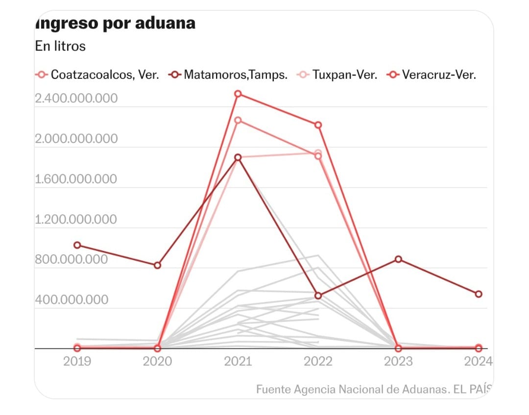 Las importaciones atípicas de aceites lubricantes no se limitaron a este puerto del Golfo de México. Al menos 21 aduanas en Guerrero, Tamaulipas, Chihuahua, Veracruz, Tabasco, Sonora, Baja California, Baja California Sur, Colima, Michoacán, Sinaloa, Coahuila y Yucatán registraron también incrementos inexplicables en la importación del aditivo.