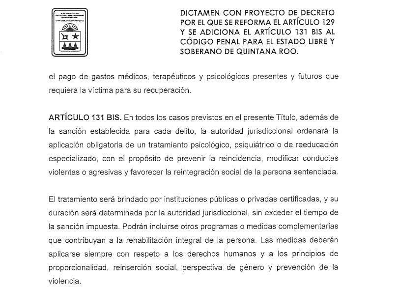 En esta parte el Congreso del Estado también retiró de la reforma la obligación de cumplir el tratamiento psicológico o psiquiátrico para acceder a beneficios de libertad anticipada, sustitución de pena o suspensión condicional de la ejecución, por estas son materias que sólo puede legislar el Congreso de la Unión.