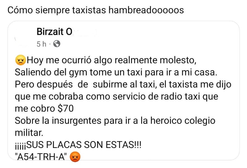 El trayecto, según explicó, fue sobre la avenida Insurgentes con destino a la colonia Heroico Colegio Militar, un recorrido urbano corto que, bajo la tarifa ordinaria, no debería superar los 40 pesos. La persona compartió también las placas del vehículo —A54-TRH-A— con el fin de alertar a otros ciudadanos sobre este tipo de cobros indebidos.