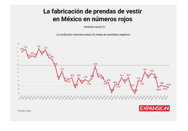 De acuerdo con datos del Instituto Nacional de Estadística y Geografía (Inegi), la fabricación de prendas de vestir permanece en terreno negativo desde noviembre de 2022.